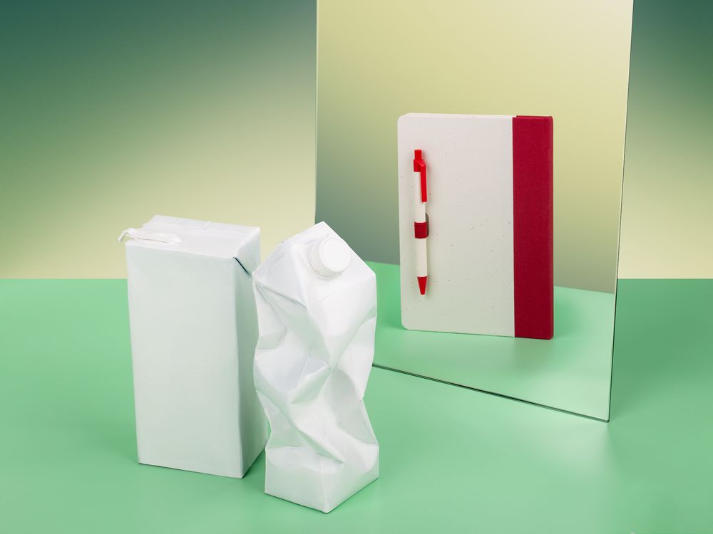 Бумага и обложка произведены из переработанных пакетов из-под молока. Обложка из картона плотностью 140 г/м² .