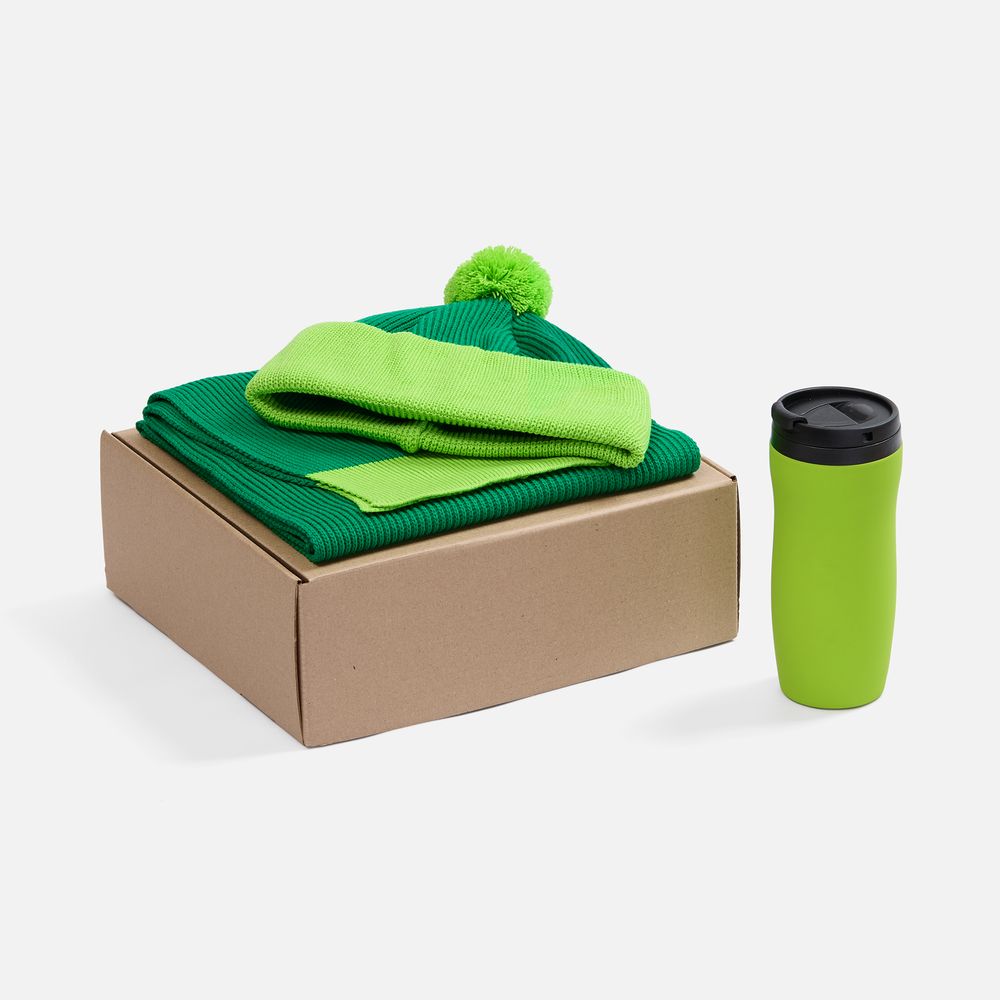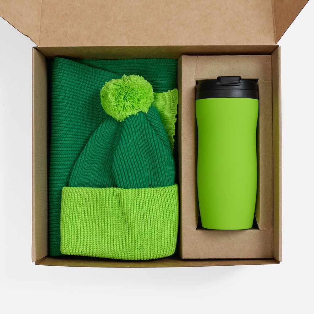 - Материал: шарф, шапка - акрил 100%; термостакан - нержавеющая сталь; покрытие софт-тач; крышка, внутренняя колба - пластик; коробка - микрогофрокартон, Т-23Е