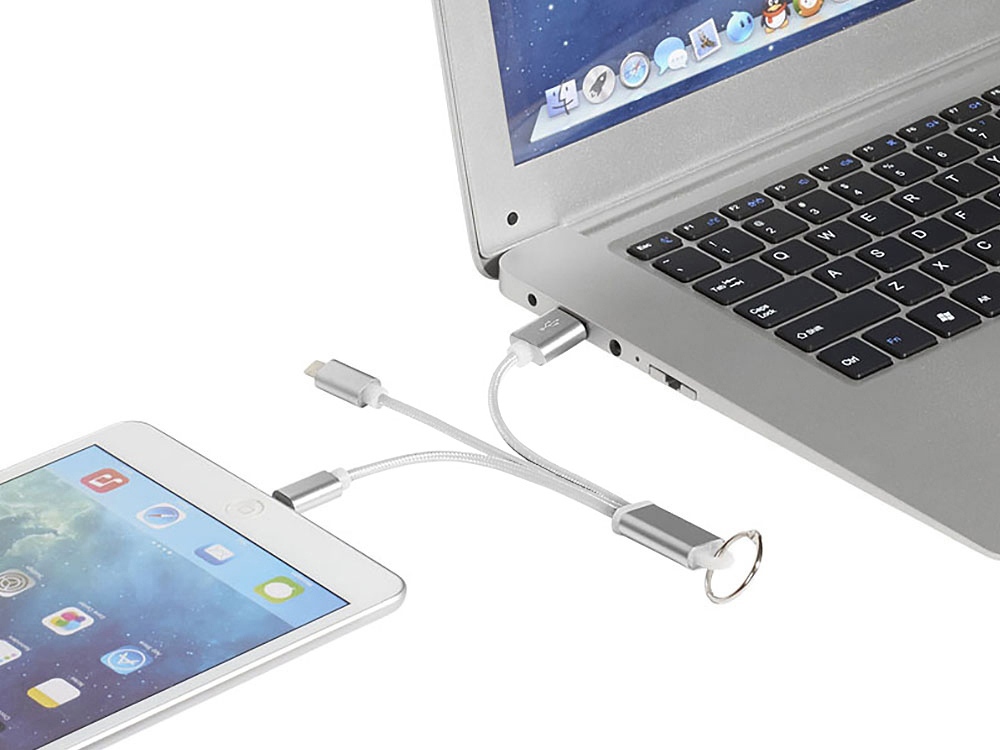Кабель для зарядки Metal 3-в-1 с брелоком, коннекторами 1 type с, 1 USB type A и двойным совместимым коннектором 2-в-1 для устройств с ОС Apple® iOS и Android. В комплект входит брелок. Для зарядки устройств Apple подключайте кабель стороной без контактов; для зарядки устройств с ОС Android подключайте кабель стороной с контактами. Алюминий.
